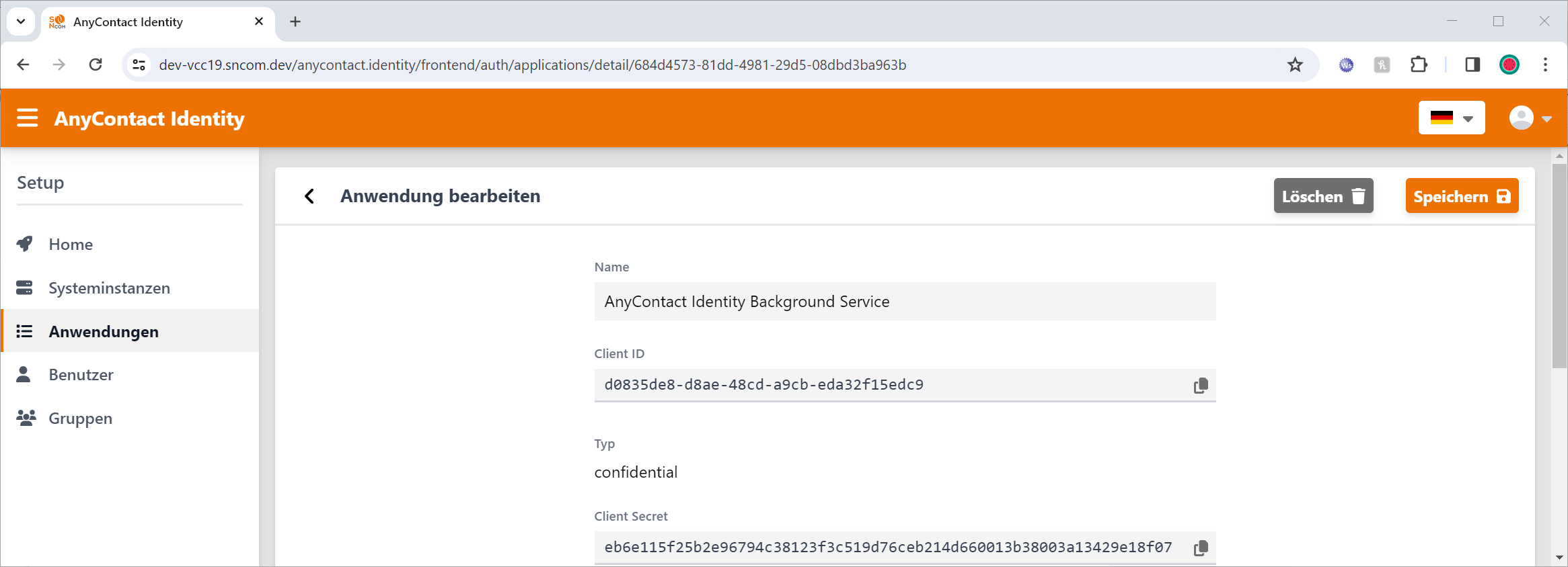 Mit einem Klick auf den Eintrag “AnyContact Identity Background Service” kommen wir in den Bearbeitungsmodus für die Anwendung. Dieser Datensatz wurde während der Erstinstallation automatisch erzeugt. Eine manuelle Erzeugung führt zu Fehlfunktionen.