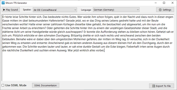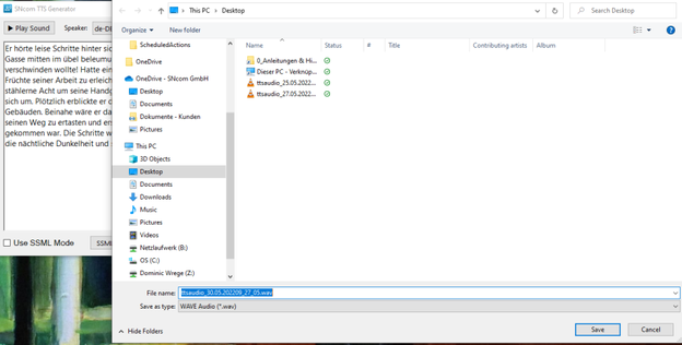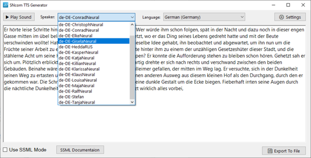 Mithilfe des „Export to File" Buttons, kann die Sprachausgabe in Form einer Wave-Datei auf dem Computer exportiert werden.