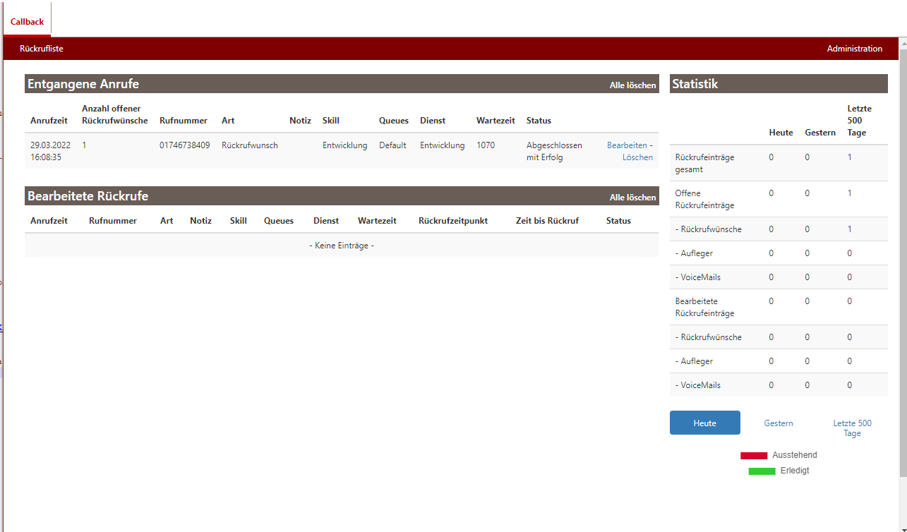 Das Callback Modul bietet eine Übersicht und Statistik über getätigte Rückrufe.