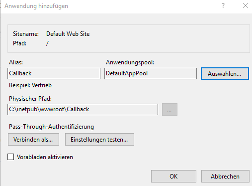 Freitext – zur Vereinfachung wird empfohlen, den Verzeichnisnamen der Installation zu verwenden – z.B. „CallbackModul"