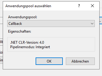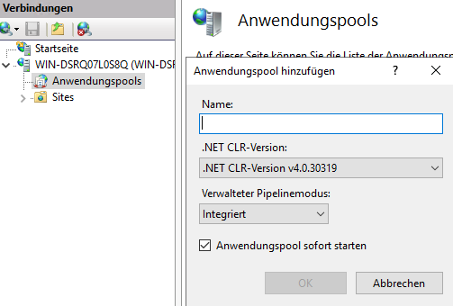 Mit dem Klick auf „Anwendungspool hinzufügen" öffnet sich ein neues Fenster für die Baiskonfiguration.