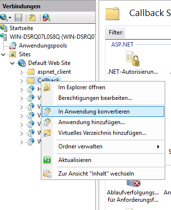 Innerhalb des Navigationspunktes „Sites" und „Default Web Site", erscheint der Installationsordner.