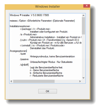 Für eine Auflistung der Standardparameter des Windows Installer öffnen Sie die Eingabeaufforderung. Geben Sie „msiexec" ein. Danach öffnet sich ein Dialog mit den Informationen der Parameter: