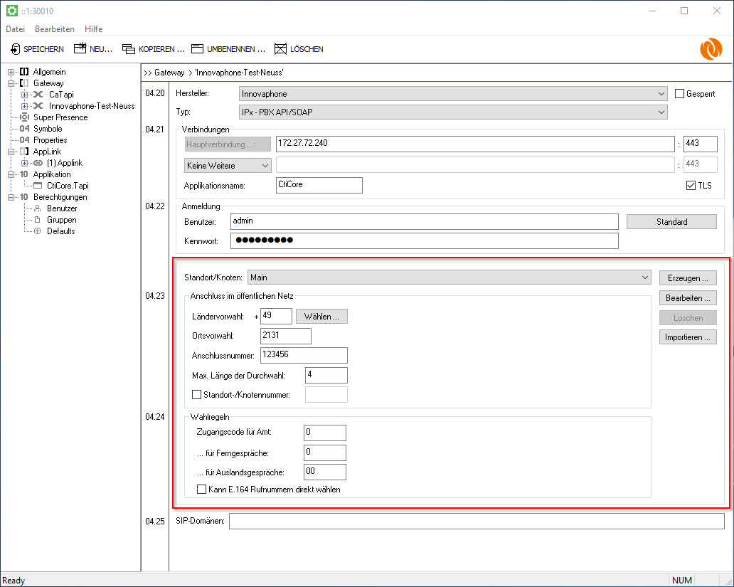 Wenn an einer PBX unterschiedliche Knoten und Standorte betrieben werden, sind die Rufnummern der Nebenstellen optimalerweise im E.164 Format zu verwenden. Um die Erzeugung von E.164 Rufnummern durch den CTI Core zu ermöglichen, müssen Knoten eingerichtet werden. Knoten werden in der Konfiguration eines Gateways hinterlegt.