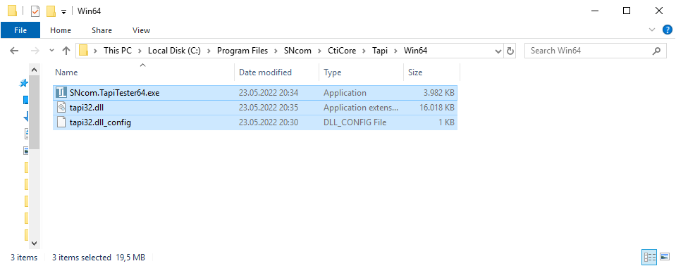 Die tapi32.dll sowie der Konfigurationsdatei und das Tapi Testtool sind aus dem CTI Core Installationsverzeichnis in das Anwendungsverzeichnis der konsumierenden Applikation zu kopieren. Je nach Architektur der Applikation ist entweder die 64bit (Win64) oder 32bit (Win32) Version zu verwenden.