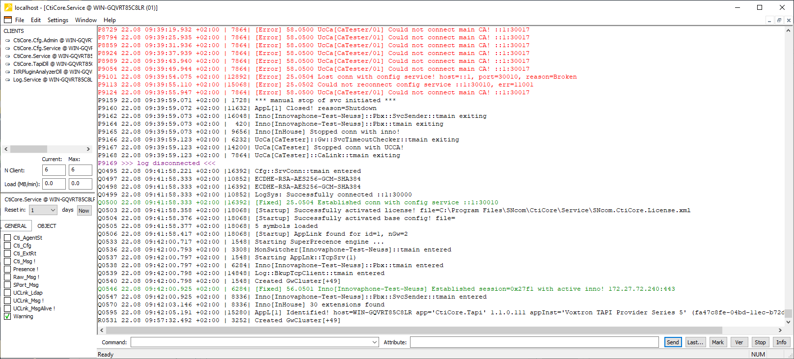 Nach einem Erfolgreichen Login durch einen Klick auf den Button “Connect” öffnet sich das Log Terminal. Hier werden wie zu Anfang der Dokumentation beschrieben, alle verbundenen Dienste, deren Logkategorien und deren Echtzeit-Log ausgegeben. Für eine Überprüfung des CTI Cores ist der Client “CtiCore.Service” zu wählen.