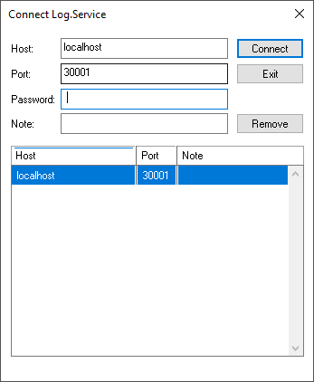 Nach dem Start des Log Terminals muss eine Verbindung mit dem LogSys Service aufgebaut werden. Hierzu ist im Anmeldedialog der Host anzugeben, auf welchem der LogSys Dienst installiert ist. Dies ist bei einer Standardinstallation “localhost”. Der Port, sofern er nicht geändert wurde lautet “30001”.