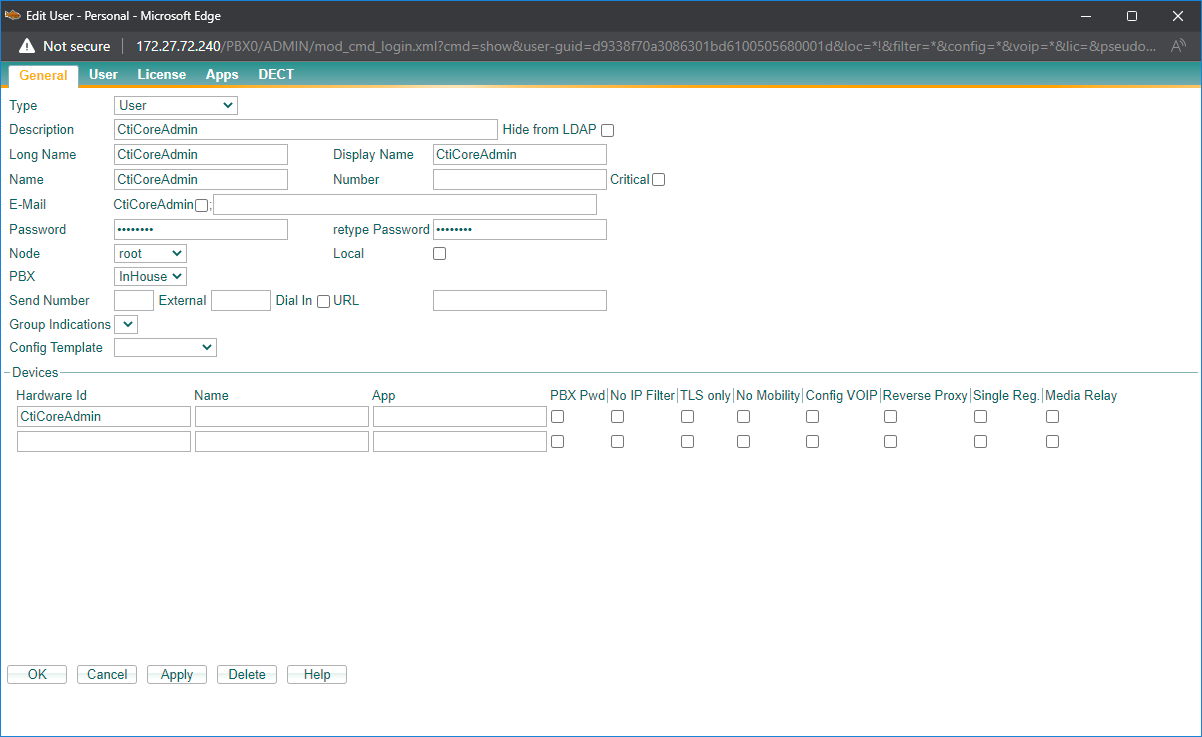 Als ersten Schritt muss auf der innovaphone ein Userobjekt für den CtiCore angelegt werden.