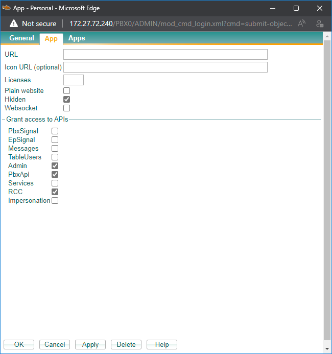 Bevor die App mit dem Button “Apply” gespeichert wird, sind folgende Einstellungen im Reiter “App” einzustellen.