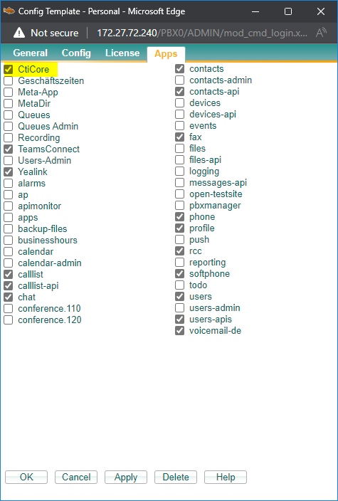 Die Zuordnung der CTI Core App zu Config Templates oder Benutzers geschieht auf die gleiche Art und Weise. Innerhalb des Objekts wird unter dem Reiter “Apps”, die “CtiCore” App ausgewählt und abschließend gespeichert.