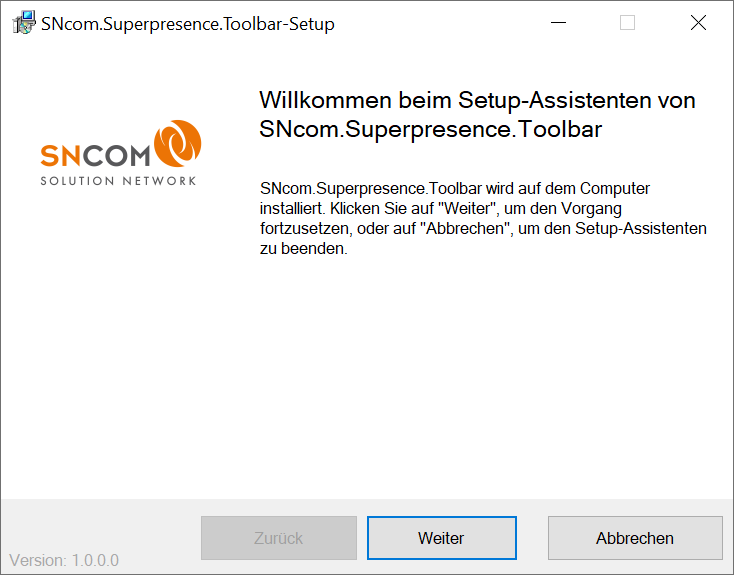 Die Superpresence Toolbar wird mit einem MSI-Installationspaket ausgeliefert. Nach dem Ausführen der Installationsdatei erscheint der Installationsassistent.