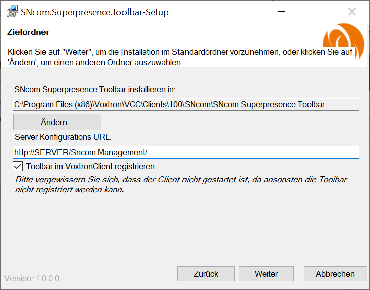 Der Voxtron Client darf vor der Installation nicht geöffnet sein, ansonsten kann die Toolbar nicht registriert werden.