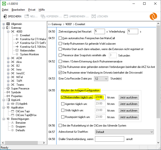 Aus einer Unify OpenScape 4000 kann der CtiCore.Service die Rufnummern der vorhandenen Nebenstellen auslesen. Der Vorgang erfolgt unmittelbar nach dem Aufbau der CSTA-Verbindung. Für eine zyklische Wiederholung des Vorganges muss zusätzlich ein Haken in der Konfiguration gesetzt werden.