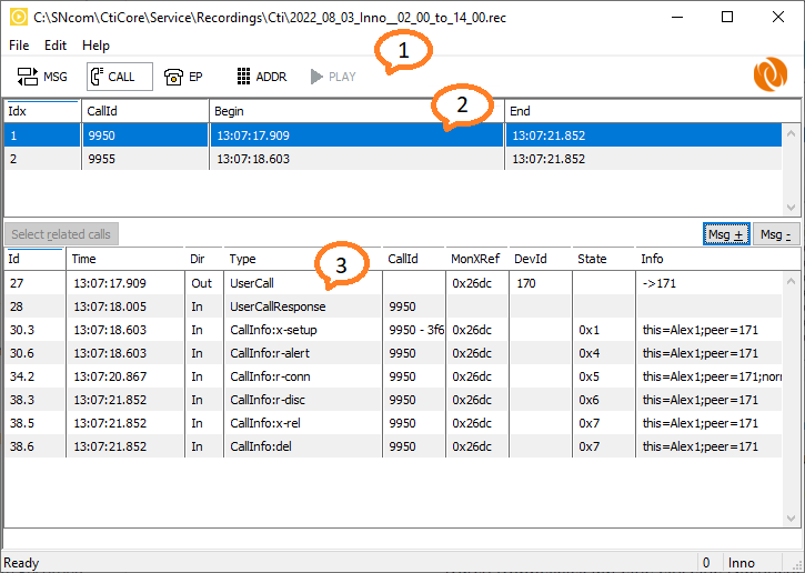 Mit Hilfe des Player werden die einzelnen Nachrichten aus einem Recording eingelesen und nach verschiedenen Kriterien sortiert. Die grafische Darstellung ermöglicht es einzelne Vorgänge schnell zu isolieren und zu analysieren.