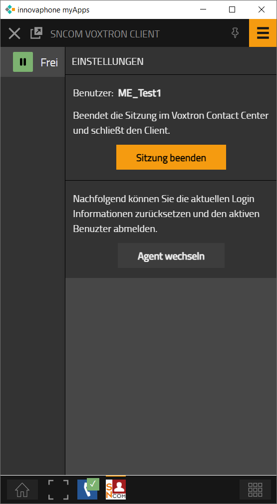 Über das Hamburger-Menü (siehe rechts oben in der Abbildung: Agent Abmelden | Agent wechseln) gibt es die Möglichkeit über die Sitzung beenden Schaltfläche, den Voxtron Agenten abzumelden und den Client zu schließen.