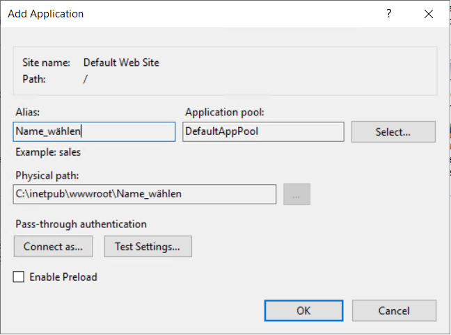Unter “Select” (siehe Bild: “Beispiel Add Application Menü“) muss der vorher angelegte Application Pool ausgewählt werden.