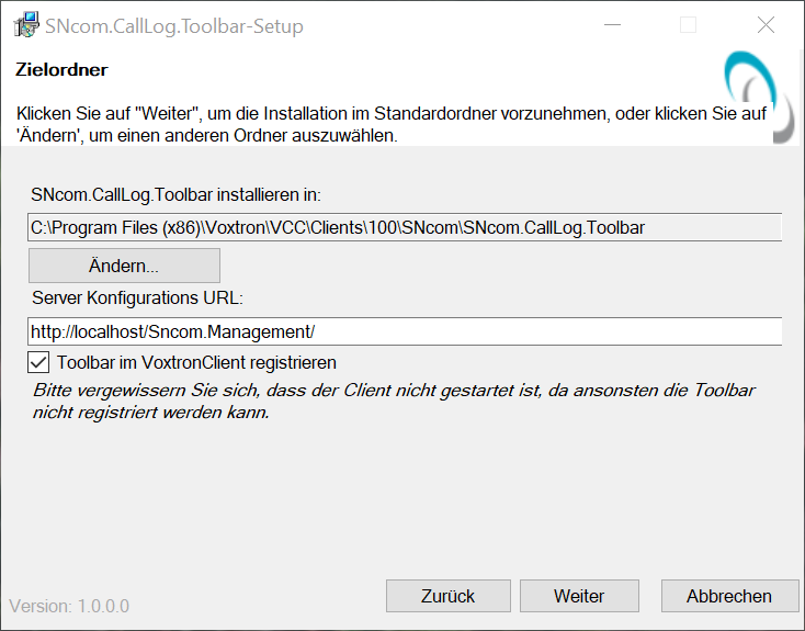 Sollte vorab eine Toolbar installiert worden sein, dann existiert bereits eine Toolbox.config Datei mit der Adresse für das SNcom Management. In diesem Fall wird die vorhandene Konfiguration nicht überschrieben.