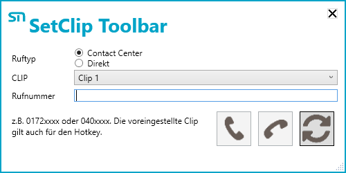 In diesem Fenster kann ausgewählt werden, ob ein Anruf als CC oder Direktes Gespräch gestartet wird. Zusätzlich dazu, kann die zu verwendende CLIP ausgewählt werden. Im Rufnummernfeld kann die Zielrufnummer eingetragen werden und mit einem Klick auf den linken Hörer der Anruf gestartet werden. Mit einem Klick auf den mittleren Hörer, kann das aktuelle Gespräch beendet werden. Mit einem Klick auf den rechten Button, werden die Verfügbaren Clips aktualisiert.