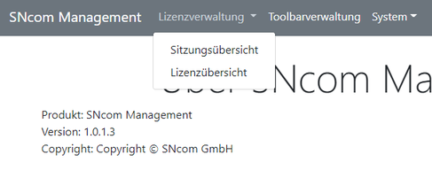 Durch das Öffnen des „Lizenzverwaltung"-Drop-Down-Menüs werden Menüpunkte sichtbar, mit denen zur „Lizenzverwendung (Sitzungsübersicht)" und „Lizenzverwaltung (Lizenzübersicht)" navigiert werden kann.