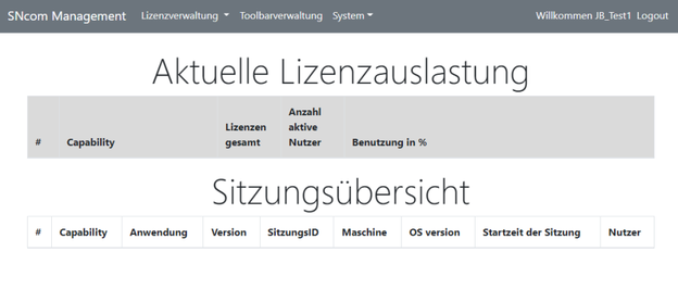 Die Seite „Lizenzverwaltung -> Sitzungsübersicht" zeigt eine Ansicht der aktuellen Lizenzauslastungen und der Sitzungsübersichten.