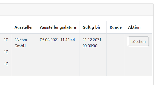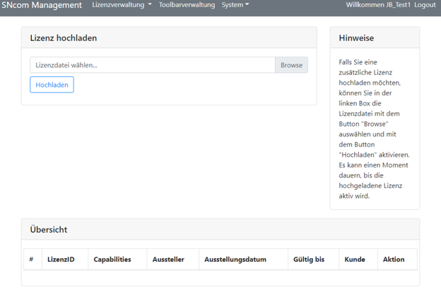 Wenn eine gültige Lizenz hochgeladen wurde, erscheint diese in der Übersichts-Tabelle.