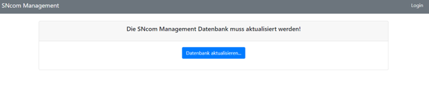 Sollte ein Datenbankupdate anstehen oder diese noch nicht vorhanden sein, wird der Benutzer beim Aufrufen von SNcom Management aufgefordert, die Datenbank zu aktualisieren. Dieser Prozess aktualisiert die Datenbank auf den aktuellen Stand. Sollte die Datenbank noch nicht vorhanden, wird diese automatisch erstellt. Sollte die Installation ohne SQL Berechtigung zum Erstellen einer Datenbank oder auf einem Cluster durchgeführt werden, so ist die Datenbank mit beliebigen Namen – vor – der Installation von SNcom Management manuell zu erstellen.