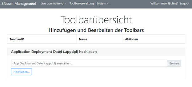 Zum Aktivieren einer Toolbar muss eine App Deployment Datei (.appdpl) hochgeladen werden. Diese liegt dem Installationspaket bei.