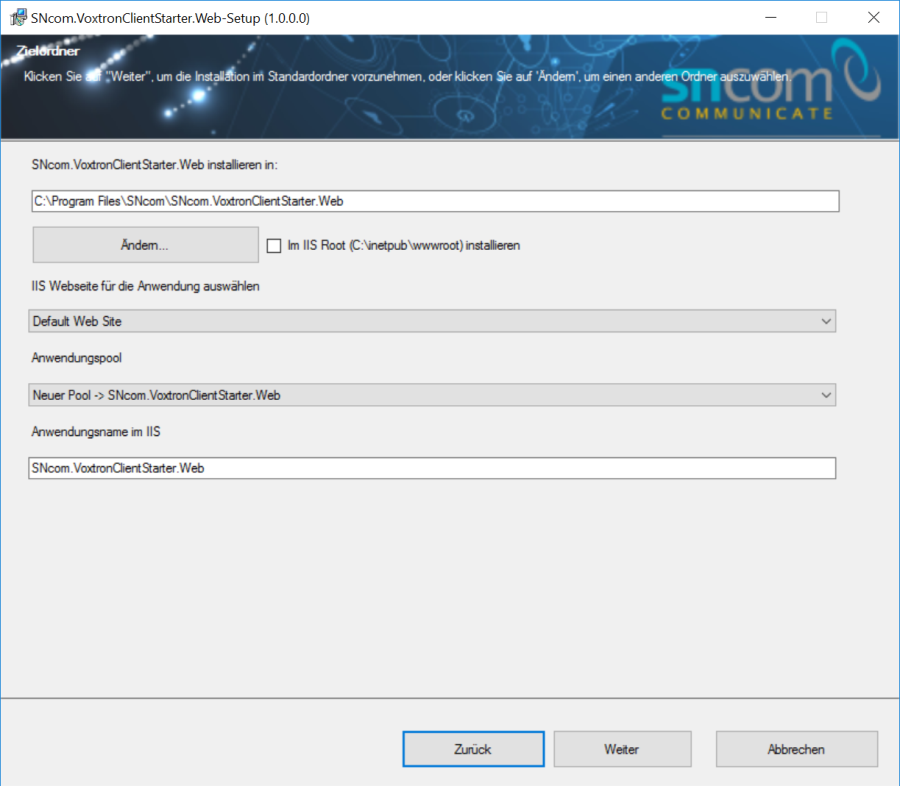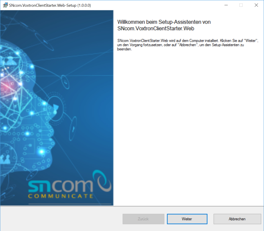 Nach dem Öffnen des Installationsdatei „SNcom.VoxtronClientStarter.Web.msi" erscheint der Installationsassistent.