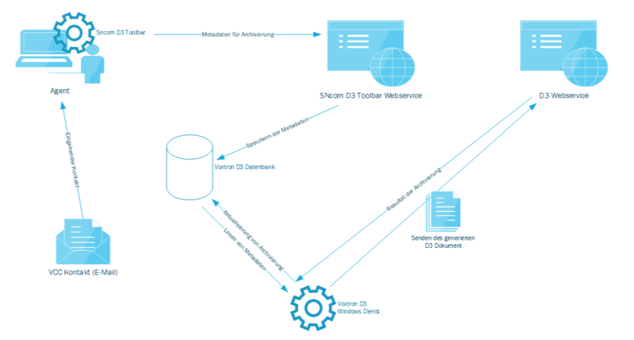 Die D3 Toolbar ermöglicht es, über das Voxtron Communication Centereingegangene Faxe, sowie Emails in Form von EML-Dateien an das Dokumentenverwaltungssystem d.3 zu übergeben. Hierbei haben Agenten die Möglichkeit, E-Mails, die sie aktuell bearbeiten, über eine separate Toolbar mit Schlagworten zu versehen und anschließend zu archivieren.