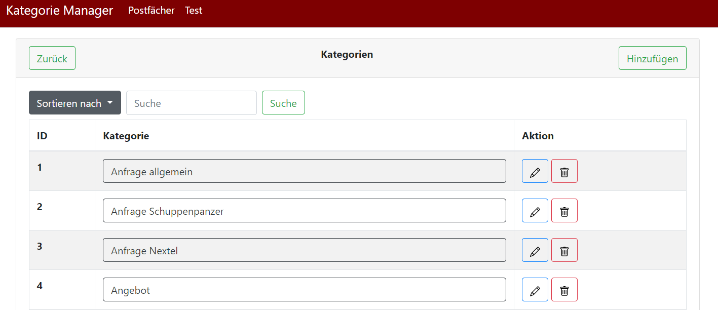 Die aktuell vorhandenen Kategorien können hinzugefügt (Hinzufügen-Button rechts oben), bearbeitet (Stift) oder gelöscht (Mülltonne) werden.