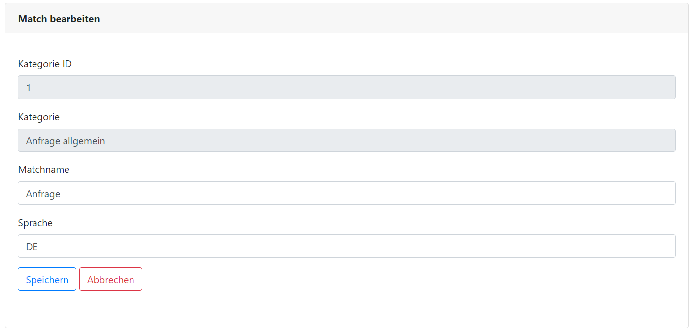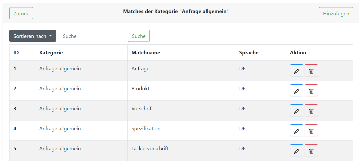 Wird eine Kategorie ausgewählt, so werden alle Matches angezeigt, die für die jeweils ausgewählte Kategorie angelegt wurden. Die Matches können neu hinzugefügt (Hinzufügen-Button oben rechts), bearbeitet (Stift) und gelöscht (Mülltonne) werden (siehe Bild: Matches der Kategorie “Anfrage allgemein“).