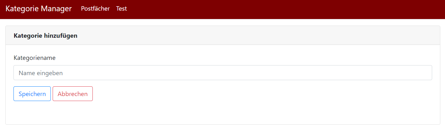 Der Hinzufügen-Button führt auf eine Seite, auf der sich ein Formular befindet (siehe Bild: Kategorie hinzufügen). Hier kann der Name für eine neue Kategorie angegeben werden und gespeichert werden. Somit wird eine neue Kategorie angelegt.
