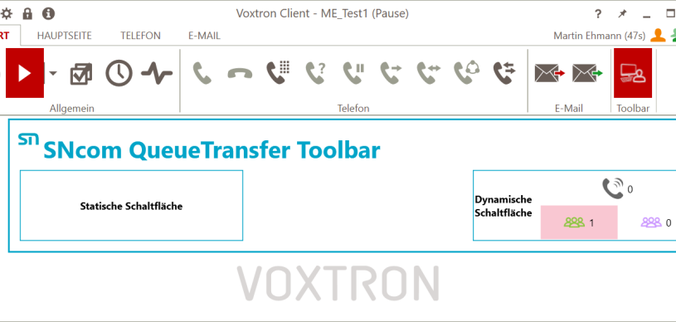 Bei Klick auf die Schaltfläche wird der aktuelle Ruf zum hinterlegten Ziel weitergeleitet. Die Weiterleitung erfolgt dabei der Konfiguration entsprechend durch überwachtes („Consult") oder direktes („Blind") Weiterleiten. Dabei werden verschiedene Informationen, wie das ursprünglich gerufene Ziel und die ursprünglich gerufene Queue, als ContactProperty dem Ruf zugewiesen. Besteht kein aktuelles Gespräch, wird ein neuer Ruf zum hinterlegten Ziel aufgebaut.