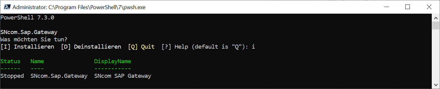 Nach der Installation wird die Information über den gestoppten Dienst ausgegeben.