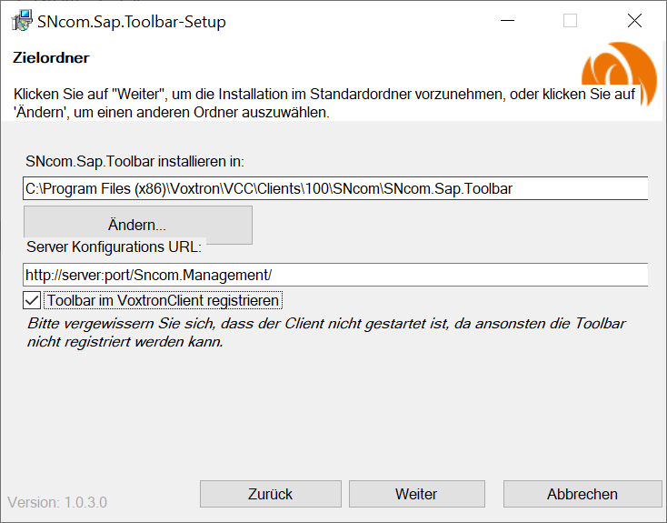 Der Voxtron Client darf vor der Installation nicht geöffnet sein, ansonsten kann die Toolbar nicht registriert werden.